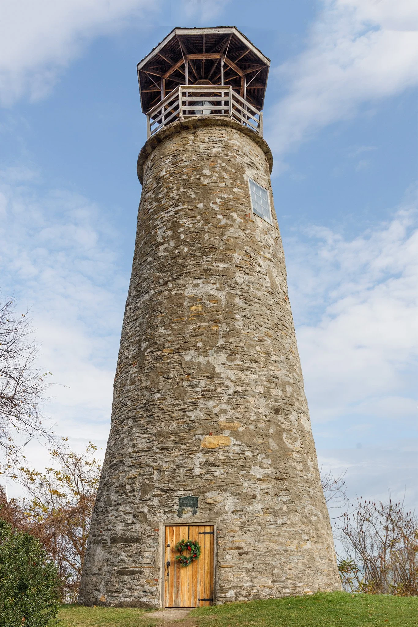 Interior stairway: Spiral wooden staircase anchored to the tower walls and a single wooden central support beam.